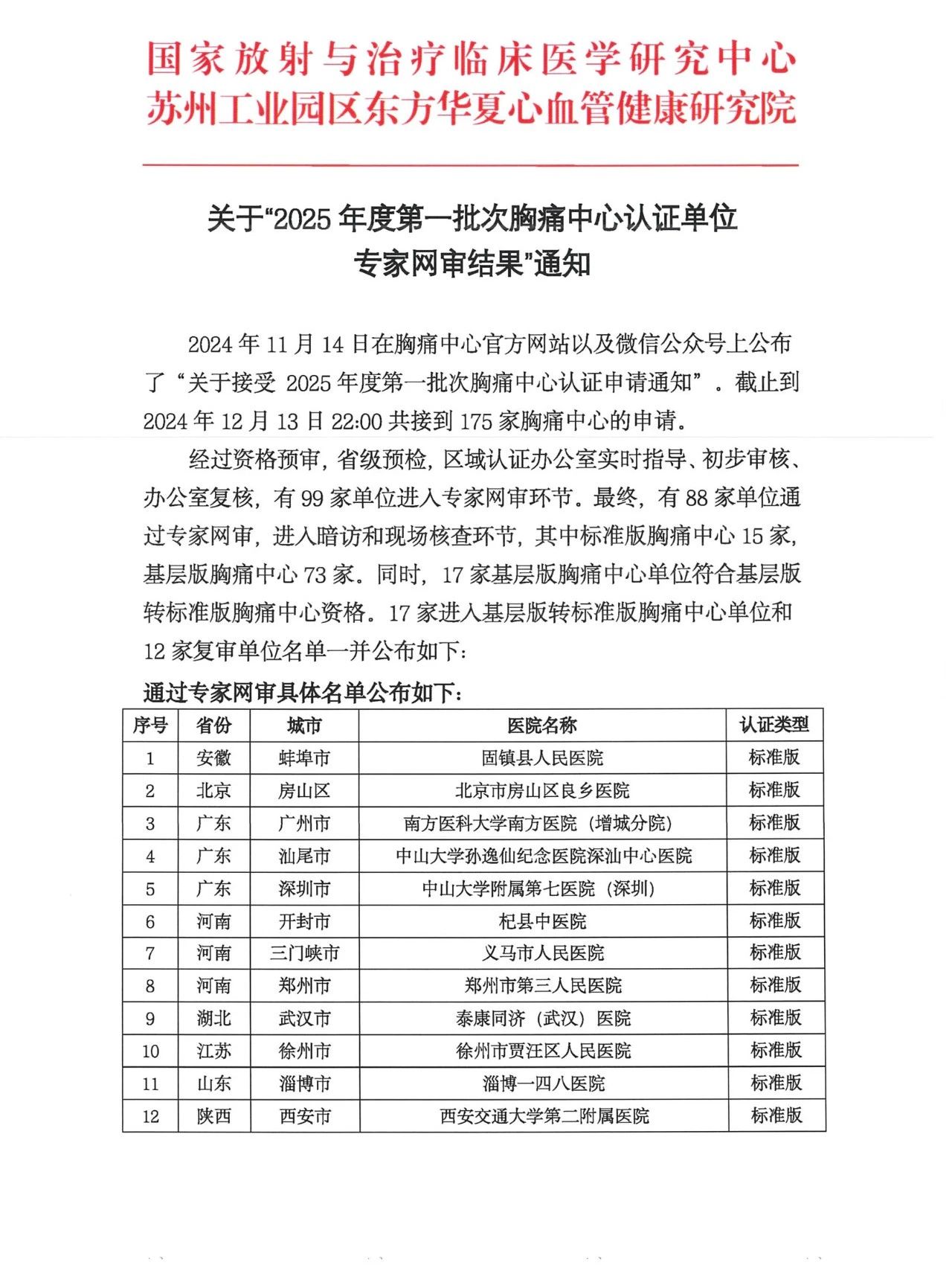 重要通知|关于2025年度第一批次胸痛中心申请认证单位专家网审结果通知