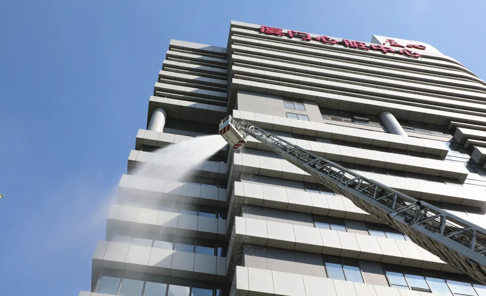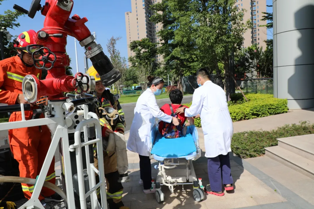 紧急扑救火情的同时,安全防护组有序开展病人疏散。现场同时还演练了高空云梯救援:一名病人被困高层避难间,消防人员赶到后,将云梯伸至9楼将其顺利救下后,医疗救护组立即将病人送至急诊进行观察抢救。最后在消防队持续水炮等灭火下,火灾得到了有效控制,演练告一段落。