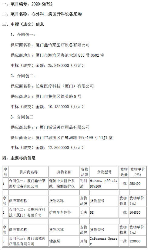 竞争性谈判-2020-SH792心外科二病区开科设备采购结果公告