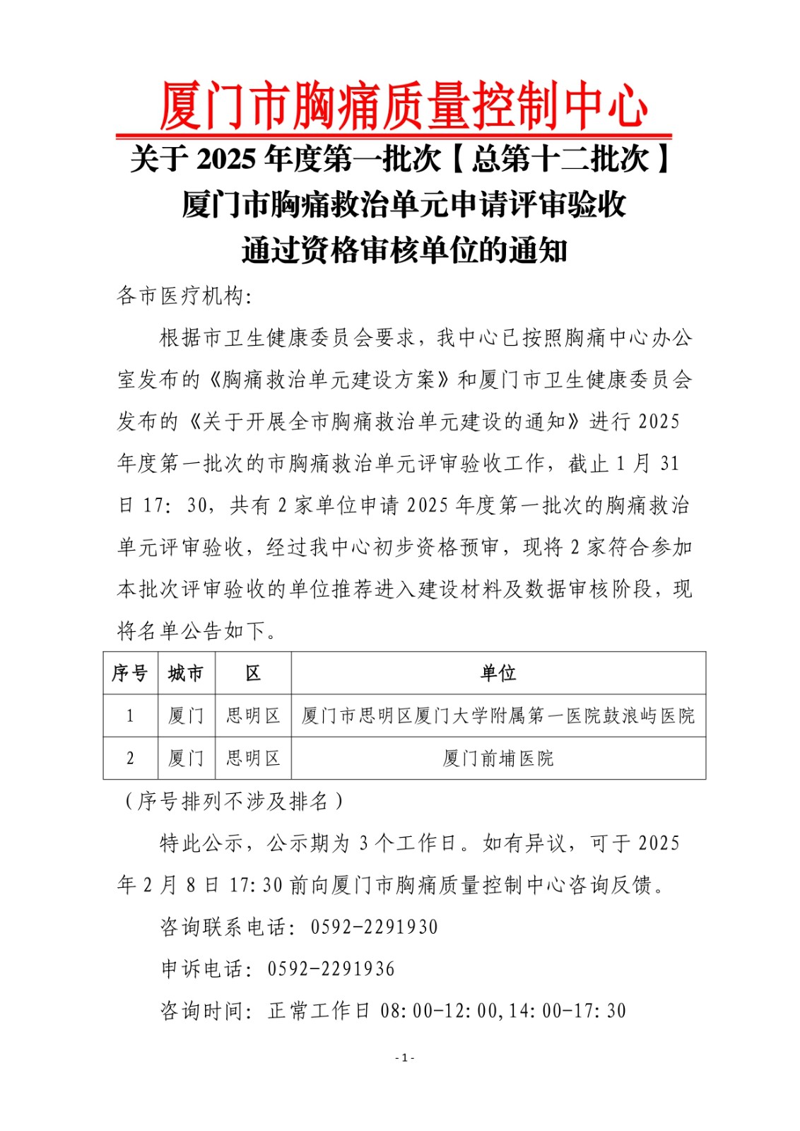 重要通知 | 关于2025年度第一批次(总第十二批次)厦门市胸痛救治单元申请评审验收通过资格审核单位的通知