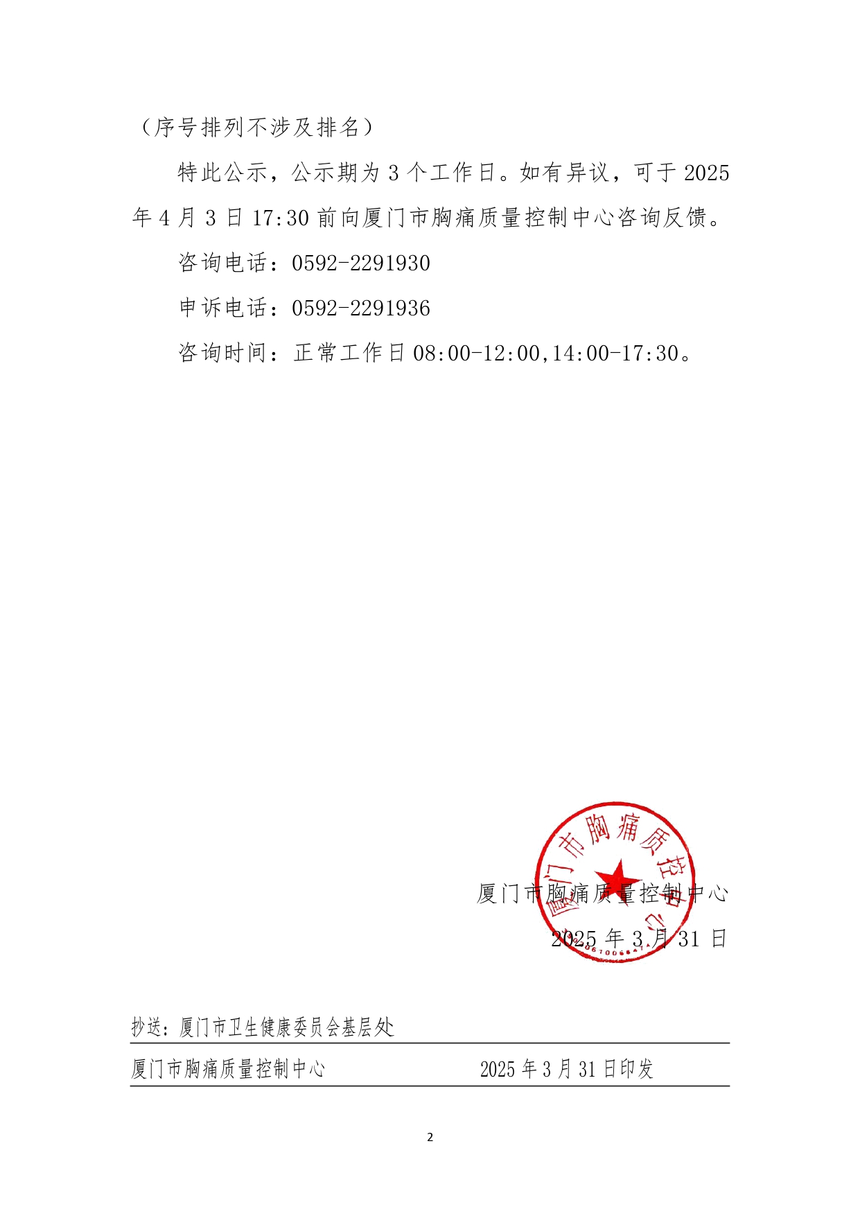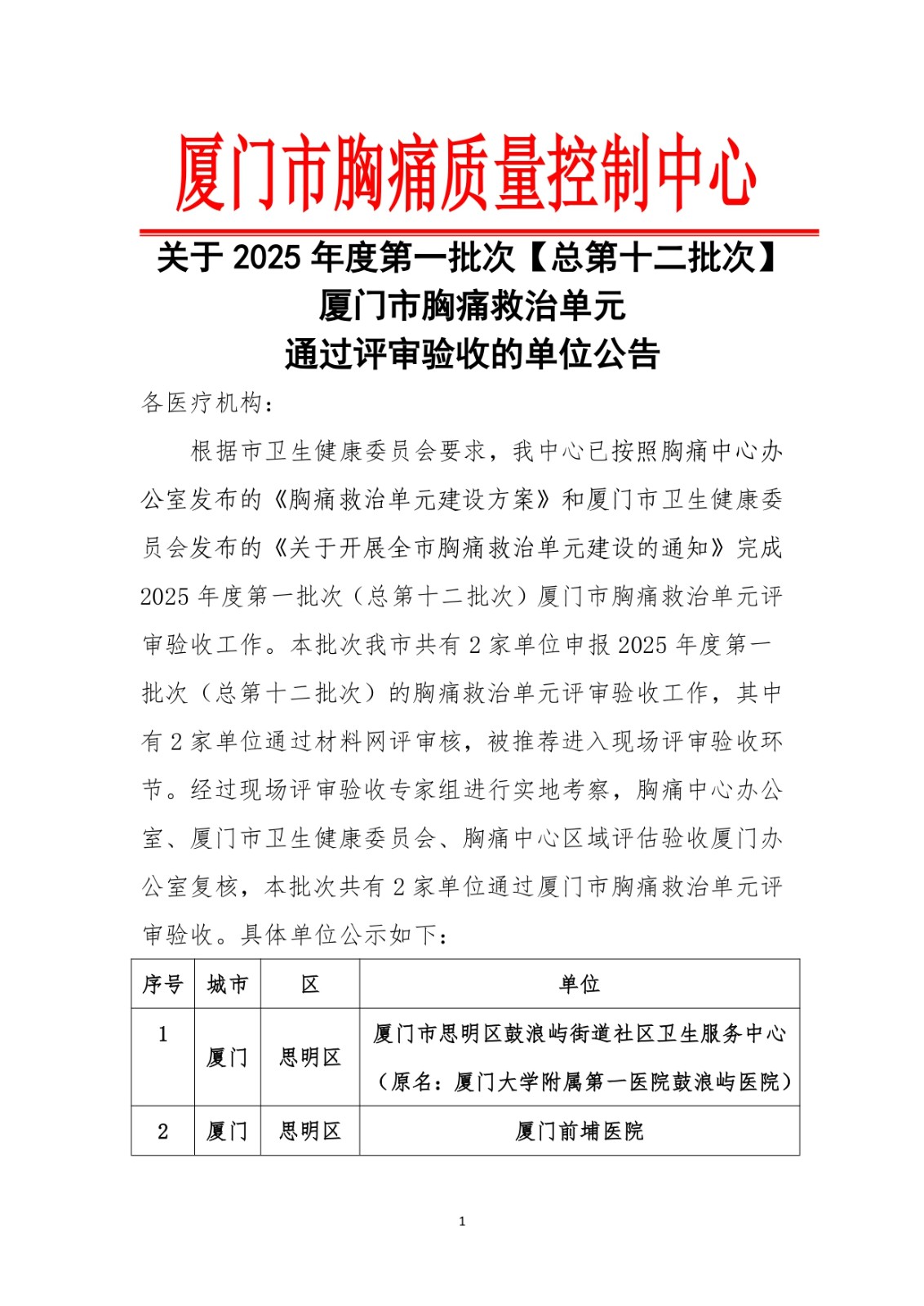 重要通知 | 关于 2025 年度第一批次(总第十二批次)厦门市胸痛救治单元通过评审验收的单位公告