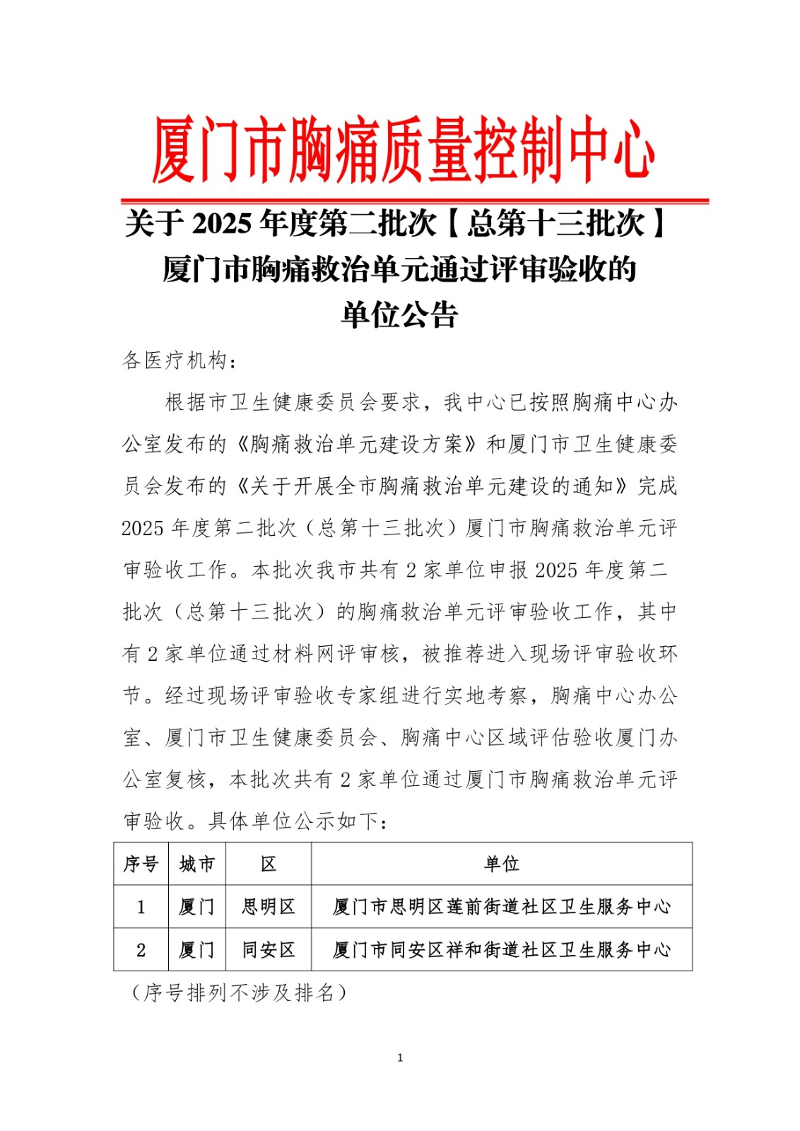 重要通知 | 关于2025年度第二批次(总第十三批次)厦门市胸痛救治单元通过评审验收的单位公告